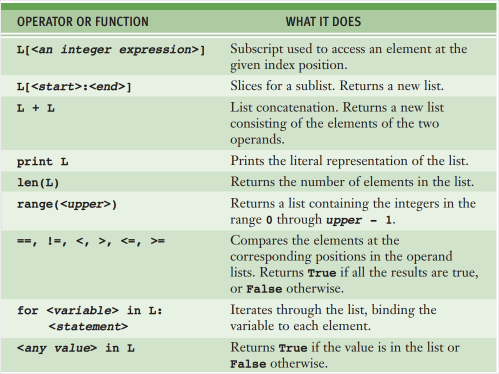 Before modifying a list with any functions or operations, you must define a list. This defines it and sets the length and data values. The following is a table of operators and functions commonly used with lists.